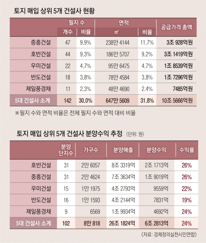 경실련이 LH가 국회에 제출한 자료와 공급 공고문 등을 통해 공급가격을 조사한 결과 이 택지들의 공급가는 10조 5666억원이었다. 이 중 호반건설이 사들인 택지의 가격이 3조 1419억원으로 5개 건설사 중 29.7%를 차지했고, 중흥건설은 3조 928억원이었다. 최승섭 경실련 부동산건설개혁본부 팀장은 “택지를 사들인 건설사가 직접 시행·시공하는 것을 의무화해야 하고, 근본적으로는 공공택지의 민간 매각을 중단하고 공공이 직접 공급해야 한다”고 지적했다.