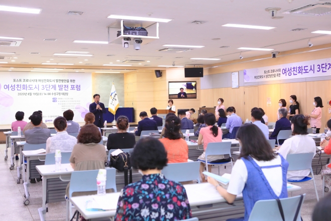 이날 포럼은 이미원 도시와 젠더 대표가 코로나시대 여성친화도시 추진과제라는 주제로 여성친화도시 수성구의 성과와 전망, 조성과제에 대해 발제를 하고, 엄기복 대구일가정양립지원센터장이 좌장을 맡아 진행했다.