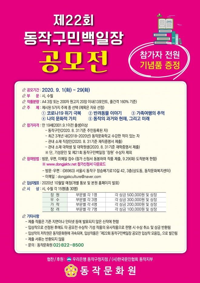 참가자격은 만 19세 이상 동작구민, 동작문화학교 수강생, 관내 소재 직장인·대학생·대학원생이다. 기성문인이나 지난해 장원 수상자는 참여가 제한된다. 코로나19 위기 극복, 반려동물 이야기, 가족여행의 추억, 나의 문화적 가치, 동작의 과거와 현재 그리고 미래 등 5가지 주제 중에 시와 수필부문에 응모하면 된다. 참여를 원하는 주민은 다음달 29일까지 동작문화원으로 방문하거나 이메일로 작품을 제출하면 된다.