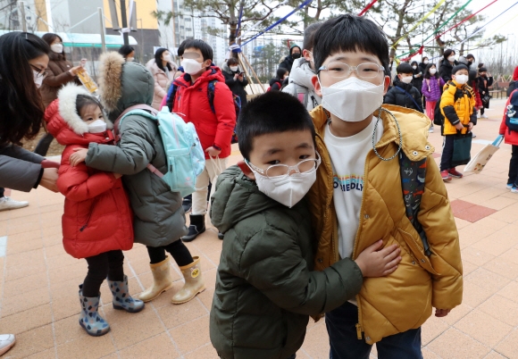 2021학년도 초·중·고교 첫 등교가 시작된 2일 오전 서울 강동구 강빛초등학교에서 오랜만에 만난 학생들이 서로를 안아 주고 있다. 이날 설레는 아이들의 웃음과는 무관하게 EBS 온라인클래스 등 공공 학습관리시스템(LMS)과 학생건강 자가진단 애플리케이션에 오류가 속출해 교육 현장에서 혼란이 발생했다.