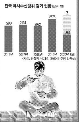지난 13일 경찰청과 박재호 더불어민주당 의원실 등에 따르면 2016년부터 지난해 8월까지 전국에서 적발된 유사수신 범죄는 3001건으로 집계됐다. 1만 152명이 피의자로 검거됐다. 유사수신행위란 금융기관으로 등록·신고하지 않고 이자를 약정해 자금을 모으는 불법 행위다. 최근엔 다단계 외에도 가짜 암호화폐를 이용한 금융사기 범죄로 진화했다. 경기남부경찰청 강력범죄수사대는 다단계 형태로 암호화폐를 판매한 ‘브이글로벌’을 특정경제범죄가중처벌법상 사기와 유사수신행위법, 방문판매업 위반 혐의 등으로 수사 중이다. 이 사건의 피해 금액은 2조원대로 추정된다.