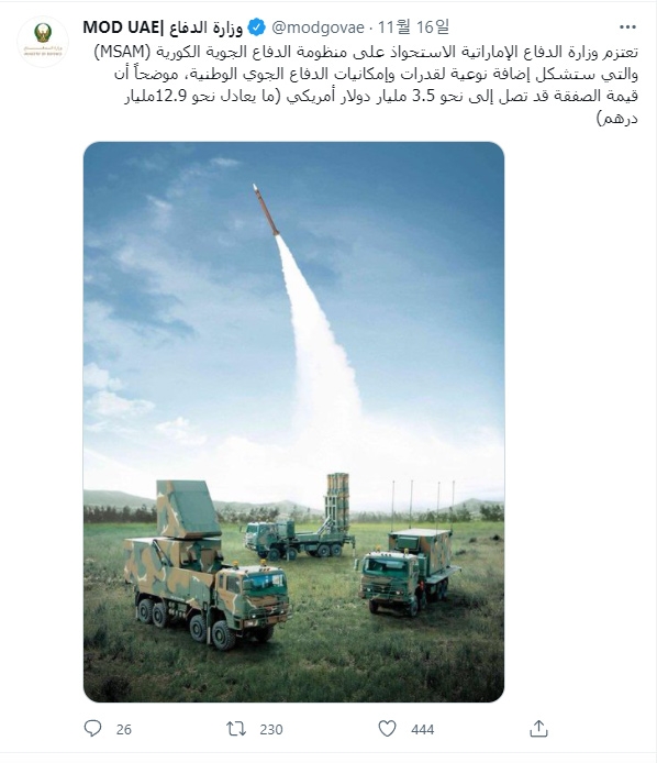 16일(현지시간) UAE 국방부는 트위터에 “방어 역량을 질적으로 보충할 한국형 방공 체계 M-SAM 도입을 추진하고 있다”면서 “계약 규모는 35억 달러(약 4조 1000억원) 상당”이라고 발표했다.