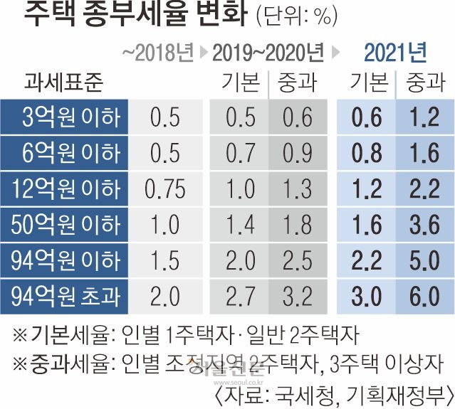 아울러 고가 주택을 한 채 보유한 사람보다 저가 주택을 두 채 이상 보유한 사람에게 세금을 더 물리면서 과세 형평성이 침해된다는 지적도 나온다. 과세표준이 50억원 이하인 1주택자 세율은 1.6%지만, 조정대상지역 2주택자는 과세표준 12억원 이하에서 이미 세율 2.2%를 적용받는다.