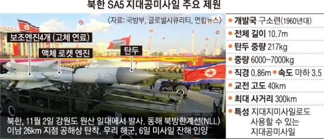 SA5는 1960년대 옛 소련이 개발한 지대공미사일(길이 10.7m, 직경 0.86m, 탄두 중량 217㎏)이다. 북한은 이 미사일을 도입한 뒤 자체 개량해 사거리를 늘렸으며 대공방어를 위해 평양 주변에 집중 배치해 놓고 있다. 지대공미사일이지만 지대지미사일로도 사용할 수 있으며, 최근 러시아도 우크라이나에서 지대지미사일로 사용한 적이 있다. 하지만 군 관계자는 “이번에 발사한 미사일이 러시아제인지는 확정할 수 없다”고 말했다.