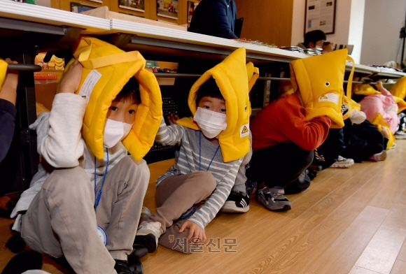 어린이들이 10일 오전 서울 마포구 희망브리지 전국재해구호협회 1층에서 열린 지진 대비훈련 ‘2022 쉐이크아웃 코리아’에 참가해 안전모자를 쓴 채 책상 밑으로 피하는 훈련을 하고 있다.