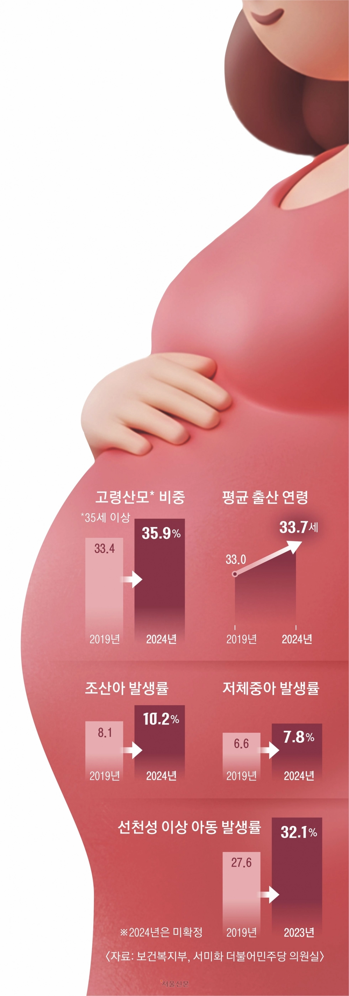 9일 서미화 더불어민주당 의원이 보건복지부로부터 제출받은 ‘미숙아 및 선천성 이상아 현황’에 따르면, 전체 출생아 중 선천성 이상아(기형·변형·염색체 이상) 비율은 2019년 27.6%에서 2023년 32.1%로 4.5%포인트 올랐다. 미숙아 비율도 2019년 8.1%에서 2024년 10.2%로, 저체중아 비율은 6.6%에서 7.8%로 상승했다. 복지부는 미숙아 증가의 원인으로 평균 출산 연령 상승, 35세 이상 고령 산모 확대, 다태아 증가를 지목했다. 실제로 지난해 평균 출산 연령은 33.7세로 2019년(33.0세)보다 0.7세 높아졌고, 고령 산모 비율은 33.4%에서 35.9%로 2.5%포인트 늘었다. 다태아 출산 비중 역시 4.6%에서 5.7%로 증가했다.