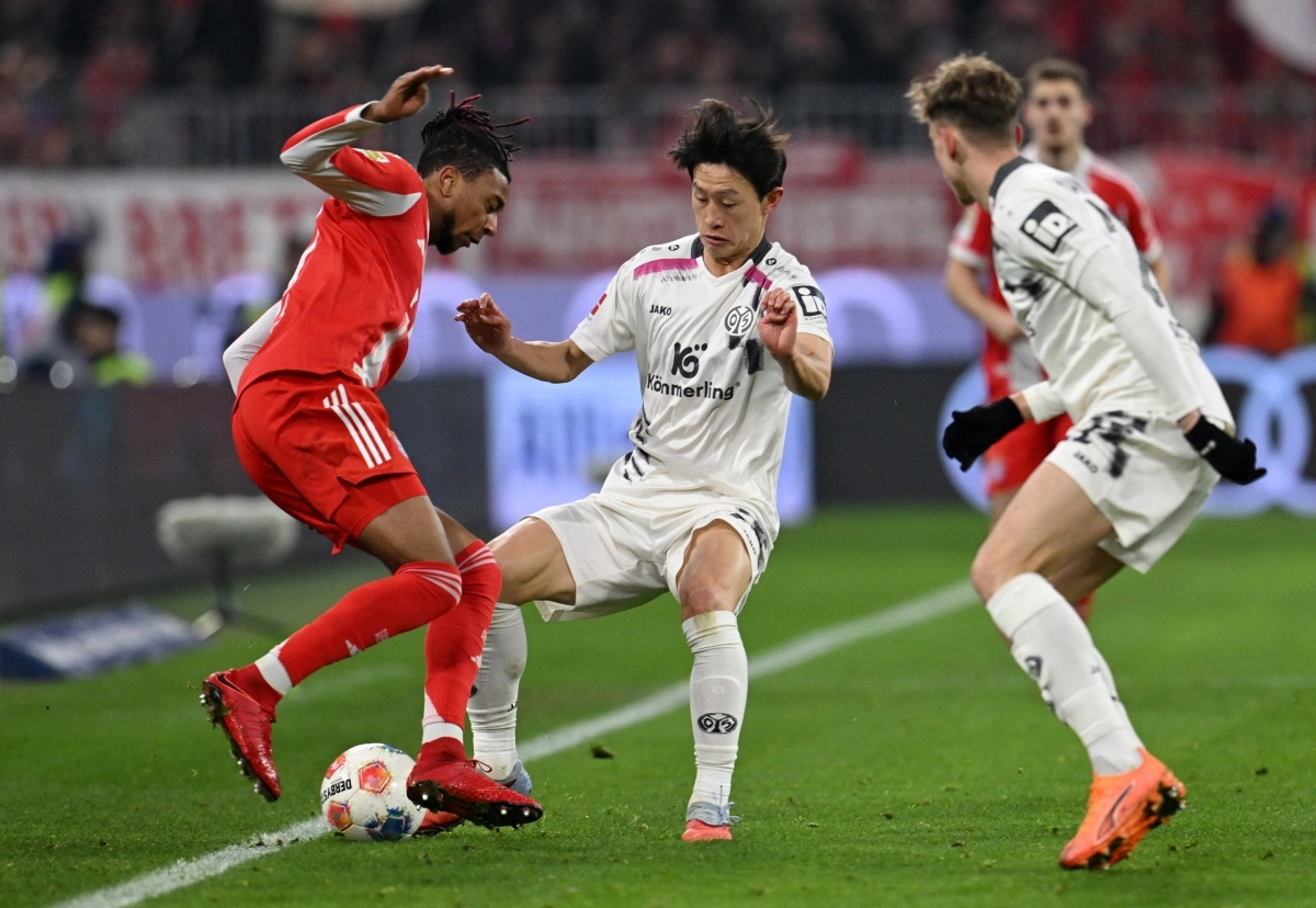 독일 프로축구 마인츠에서 활약하고 있는 이재성이 15일(한국시간) 뮌헨 알리안츠 아레나에서 열린 2025~26 분데스리가 바이에른 뮌헨과의 경기에서 상대 선수와 볼을 다투고 있다. 이재성은 1-1이던 후반 22분 역전 헤딩골에 성공했다. 그렇지만 마인츠는 동점골을 허용하며 2-2로 비겼다.