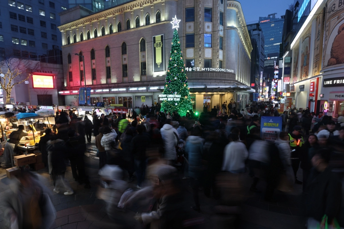 크리스마스를 하루 앞둔 24일 오후 서울 중구 명동 거리가 인파로 북적이고 있다.