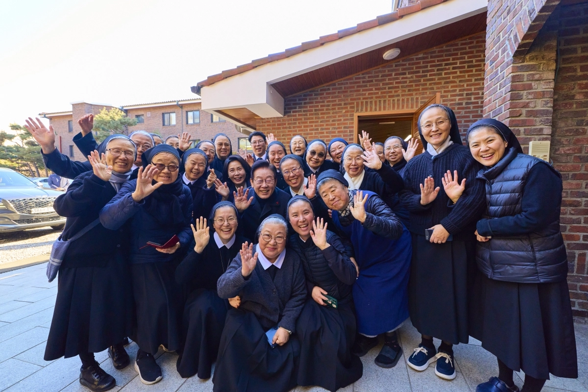 이재명 대통령과 김혜경 여사가 25일 인천 계양구 노틀담 수녀원을 방문해 수녀들과 기념촬영을 하고 있다. 이 수녀원은 장애인 복지관과 교육 시설을 운영하며 소외계층의 재활과 자립을 돕고 있다.