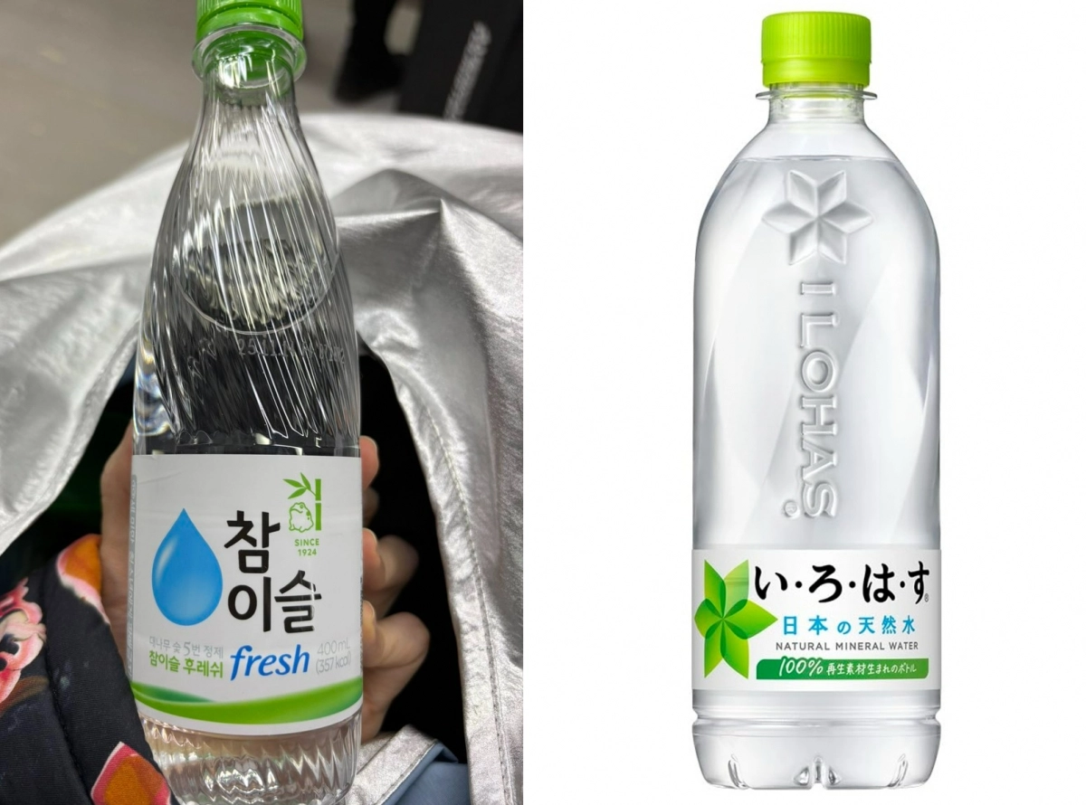 우리나라 인천공항 편의점에서 참이슬을 생수로 착각해 구매한 일본인이 올린 사진(왼쪽)과 유사한 패키지 디자인의 일본 생수 이로하스. 엑스(@curry0124) 캡처