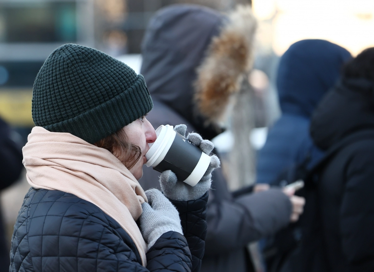 뜨거운 음료 필요한 추위 올겨울 첫 한파경보가 발령된 26일 오전 서울 종로구 광화문네거리에서 한 외국인이 뜨거운 음료를 마시고 있다. 2025.12.26 뉴스1