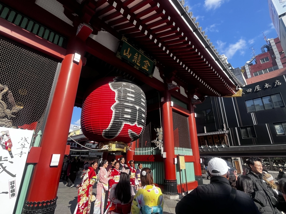 17일 일본 도쿄의 아사쿠사 센소지 입구에 위치한 붉은 등 ‘카미나리몬’을 배경으로 기모노를 입은 외국인 관광객들이 사진을 찍고 있다. 도쿄 명희진 특파원