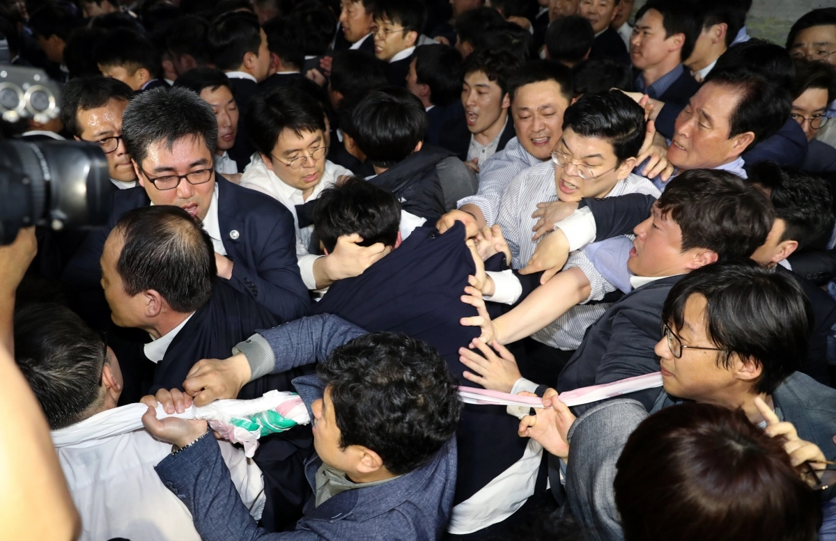 2019년 4월 공수처법 등을 패스트트랙 안건으로 처리하는 것을 막기 위해 국회에서 여야 의원들이 충돌하는 모습. 국회의장의 경호권 발동으로 국회 방호원들이 의원들을 끌어내려고 시도하고 있다. 2019.4.25 뉴스1