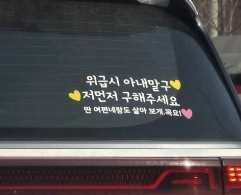 28일 엑스(X)에는 “이걸 농담이라고?”라는 제목의 게시물이 올라왔다. 사진 속 차량 후면에는 “위급 시 아내 말고 저 먼저 구해주세요. 딴 여자랑도 살아 보게. 꼭이요!” 라는 문구가 적혀 있었다.