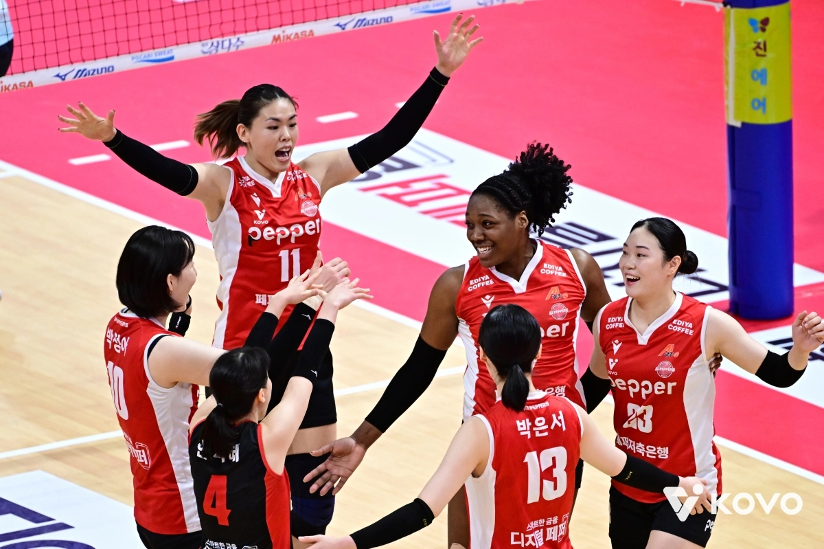 페퍼저축은행 선수들이 30일 광주 페퍼스타디움에서 열린 프로배구 V리그 여자부 홈 경기에서 GS칼텍스를 상대로 점수를 낸 뒤 기뻐하고 있다. 한국배구연맹 제공