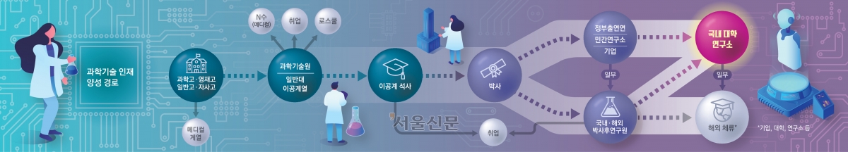 서울신문이 국내외 이공계 연구자와 현업 종사자 총 20명에 대한 심층인터뷰를 분석한 결과 과학 인재가 신진 과학자를 거쳐 성장하기까지 곳곳에는 갈림길이 놓여 있었다. 우선 과학자가 되고 싶은 청소년의 첫 선택은 학부에서 갈린다. 이공계 지망 고교생들은 대입에서 ▲자연·공학계열 진학 ▲‘의치한약수’ 등 메디컬 계열로 갈라진다.