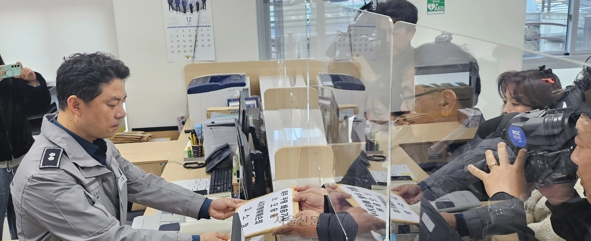 쿠팡 새벽배송 근로자 사망 유족과 택배노조는 지난달 17일 오전 제주경찰청에 쿠팡을 상대로 사자명예훼손 혐의로 고소장을 접수하고 있다.