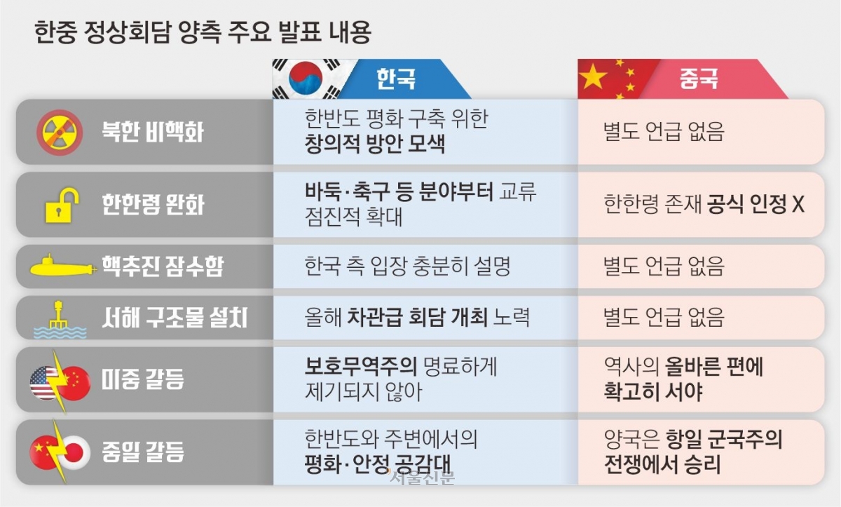 정부는 북한 문제와 관련해서도 “한반도 평화 구축을 위한 창의적 방안을 모색해 나가기로 했다”고 밝혔지만 중국은 발표 자료에 북한 문제를 언급하지 않았다. 강준영 한국외대 중국학과 교수는 “중국이 북한을 완전한 비핵화로 설득하기는 현실적으로 어렵다는 점을 감안해 북한 관련 언급을 의도적으로 배제한 것”이라고 말했다.