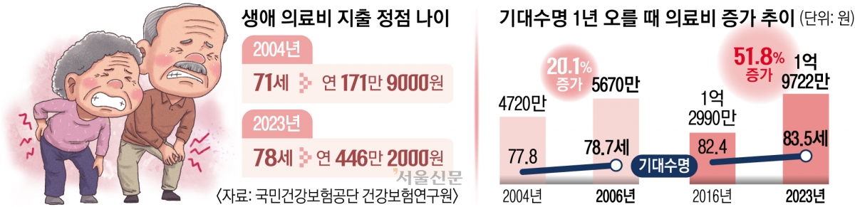 이런 변화의 배경에는 기대수명 증가가 있다. 2004년 77.8세이던 기대수명은 2023년 83.5세로 늘었다. 연구진은 “생애에서 가장 고비용 의료 서비스를 이용하는 시기가 기대수명 증가 속도보다 더 빠르게 고령기로 이동하고 있다”고 분석했다.