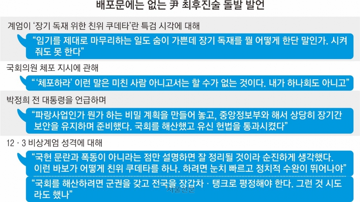 법률대리인들이 배포한 최후진술 전문은 1만 3117자였지만 윤 전 대통령은 현장에서 즉석 발언을 덧붙였다. 그 과정에서 격앙된 목소리로 정제되지 않은 발언을 내놓기도 했다.