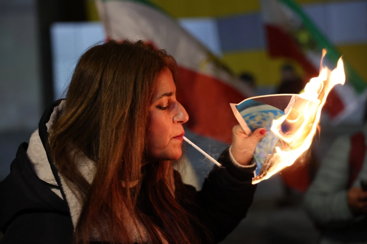 14일(현지시간) 이스라엘 홀론에서 한 이스라엘·이란 공동체 구성원이 이란에서 지속되는 반정부 시위대를 지지하는 시위에 참석해 이란 최고 지도자 알리 하메네이의 사진을 불태우고 있다. 2026.1.14 EPA 연합뉴스