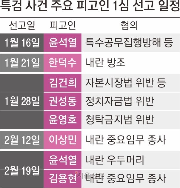 이밖에도 오는 28일엔 김건희 특검이 기소한 김건희 여사의 도이치모터스 주가 조작 등 사건과 통일교 ‘정교유착’ 관련 권성동 국민의힘 의원·윤영호 전 통일교 세계본부장 사건의 선고도 나온다. 특검은 여사에게 징역 15년과 벌금 20억원을, 권 의원과 윤 전 본부장에게는 각각 징역 4년을 구형했다.