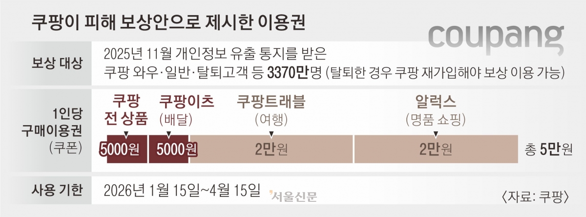 쿠팡은 이날 개인정보 유출 통지를 받은 3370만여명의 고객에게 1인당 5만원 상당의 구매이용권을 지급했다. 그러나 사용처 제한과 사용 기한 설정 등 제약이 더해지면서 소비자들 사이에서는 ‘무늬만 5만원’이라는 비판이 나온다.