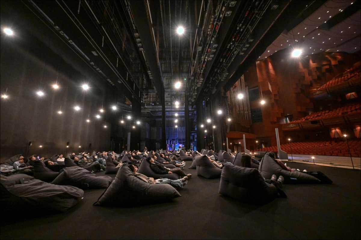 지난해 서울 종로구 세종문화회관 대극장에서 열린 청음회 ‘리스닝 스테이지’에서 관객들이 무대 위에 누워 음악을 감상하고 있다. 세종문화회관 제공