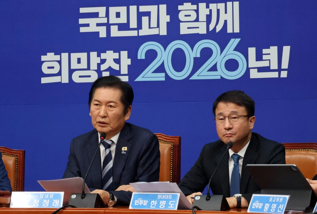 정청래(왼쪽) 더불어민주당 대표가 16일 국회에서 열린 최고위원회의에서 발언을 하고 있다. 오른쪽은 한병도 더불어민주당 원내대표. 연합뉴스