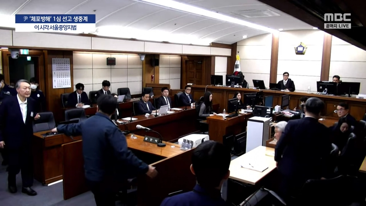 서울중앙지법 형사합의35부(부장 백대현) 심리로 열린 16일 오후 2시 윤석열 전 대통령의 특수공무집행방해, 직권남용 권리행사방해 등 혐의 사건 1심 선고공판에 윤 전 대통령이 입장하고 있다. MBC 캡처