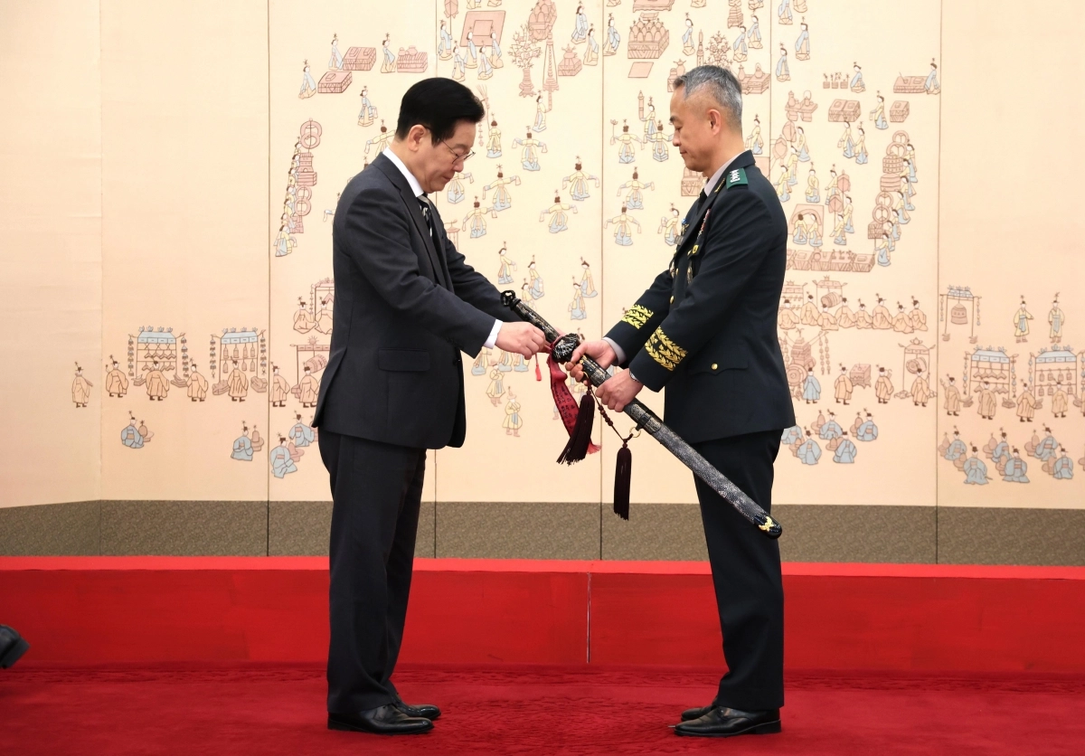 이재명 대통령이 16일 청와대 본관에서 열린 3성 장군 진급·보직 신고 및 수치 수여식에서 어창준 수도방위사령관의 삼정검에 수치를 달아주고 있다. 2026.1.16 연합뉴스