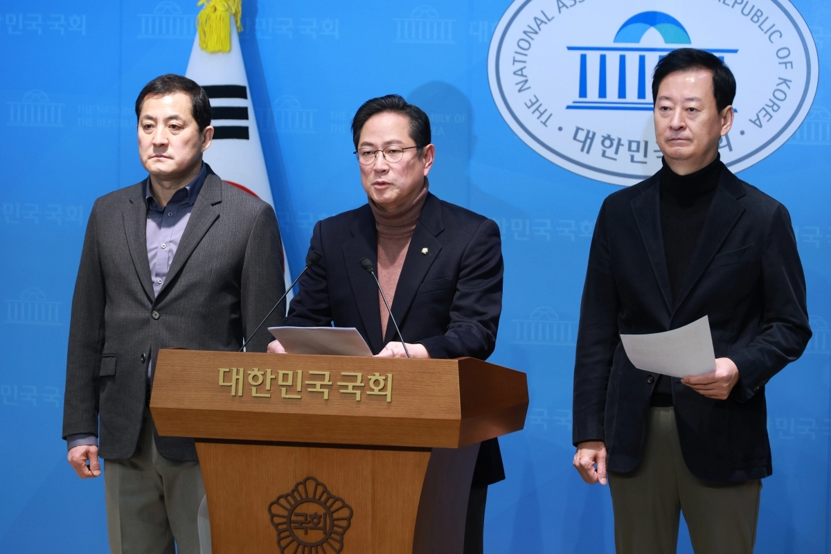 국회 재정경제기획위원회 국민의힘 박수영(가운데), 박대출(왼쪽), 최은석 의원이 18일 서울 여의도 국회 소통관에서 이혜훈 기획예산처 장관 후보자 인사청문회 관련 기자회견을 하고 있다. 2026.01.18. 뉴시스