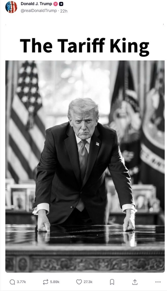 도널드 트럼프 미국 대통령이 집권 2기 1주년을 앞둔 지난 16일(현지시간) 소셜미디어(SNS)에 ‘관세 왕’이라는 문구와 함께 백악관 집무실 ‘결단의 책상’ 앞에서 두 주먹을 불끈 쥐고 있는 흑백 사진을 올렸다. 그는 ‘미스터 관세’라는 제목으로도 같은 사진을 게시했다. 재집권 후 세계 각국에 상호관세를 부과해 왔던 트럼프 대통령은 이튿날 미국의 그린란드 병합에 반대하는 유럽 8개국을 상대로 추가 관세를 매기겠다고 발표했다.