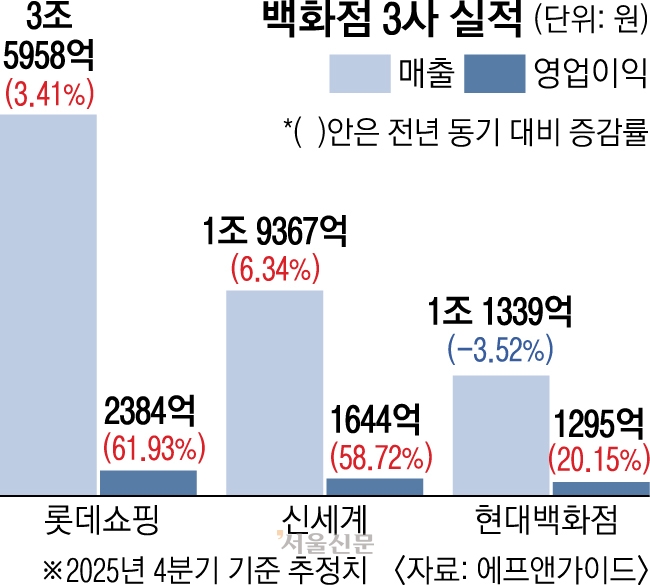 19일 금융정보업체 에프앤가이드 컨센서스에 따르면 지난해 4분기에 백화점 3사(롯데·신세계·현대)의 영업이익은 전년 동기 대비 모두 두 자릿수 상승률을 기록한 것으로 추정된다. 롯데쇼핑은 약 62% 늘어난 2384억원, 신세계는 59% 증가한 1644억원, 현대백화점은 20% 늘어난 1295억원을 기록할 것으로 예상됐다.