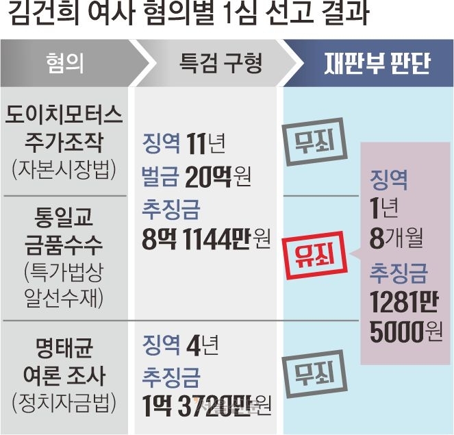 김건희 여사가 28일 세계평화통일가정연합(통일교) 금품 수수 혐의로 징역 1년 8개월의 실형을 선고받았다. 재판부는 통일교 금품 수수 의혹에 대해 “영부인에게는 걸맞은 처신이 필요하고 높은 청렴성이 요구된다. 자신의 지위를 영리 추구의 수단으로 오용했다”고 질타하며 유죄라고 판단했다. 다만 도이치모터스 주가조작·명태균 여론조사 등은 무죄로 봤다.