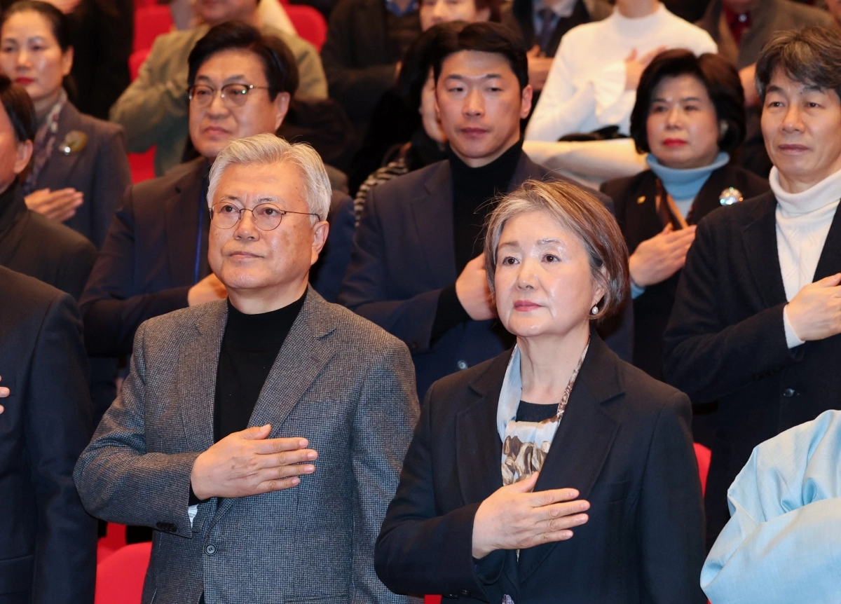 문재인 전 대통령과 김정숙 여사가 지난 17일 대전 서구 배재대에서 열린 김한수 전 배재대 부총장 출판기념회에 참석해 국기에 대한 경례를 하고 있다. 뉴스1