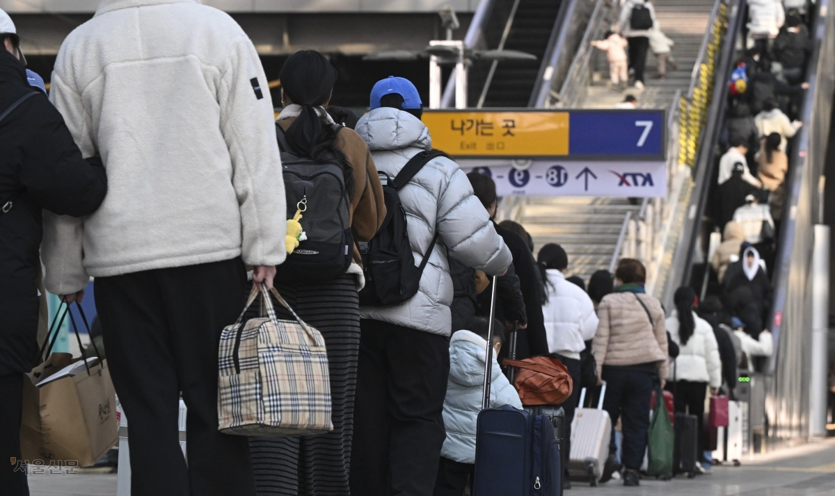 설 연휴 마지막 날인 18일 서울역에 도착한 귀경객들이 양손에 가득 짐을 들고 집으로 향하고 있다. 한국철도공사(코레일)는 귀경 수요에 대비해 열차 운행을 늘렸고, 이날 하루에만 35만석을 추가 공급했다.