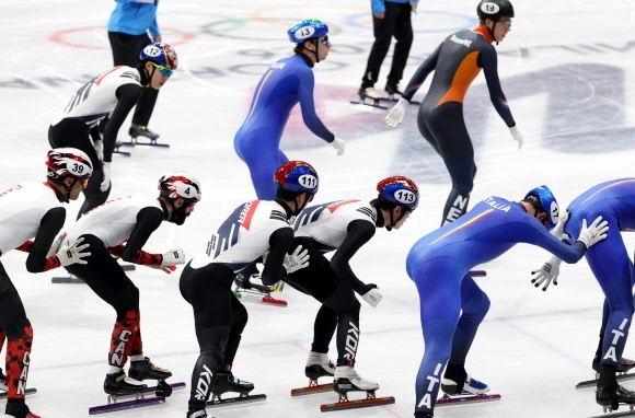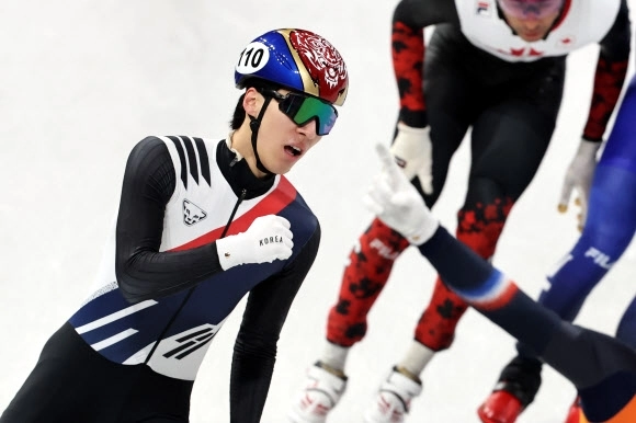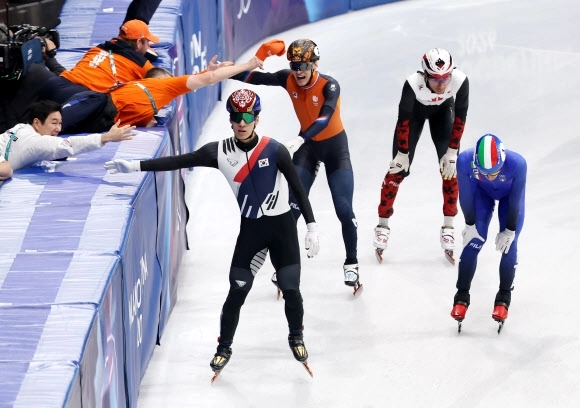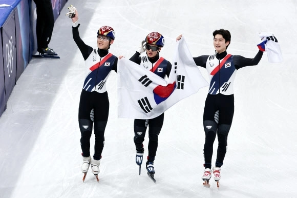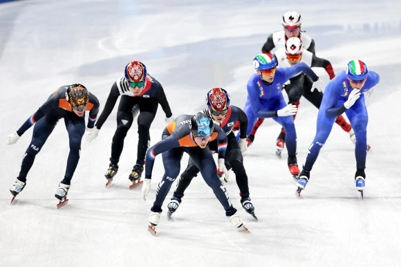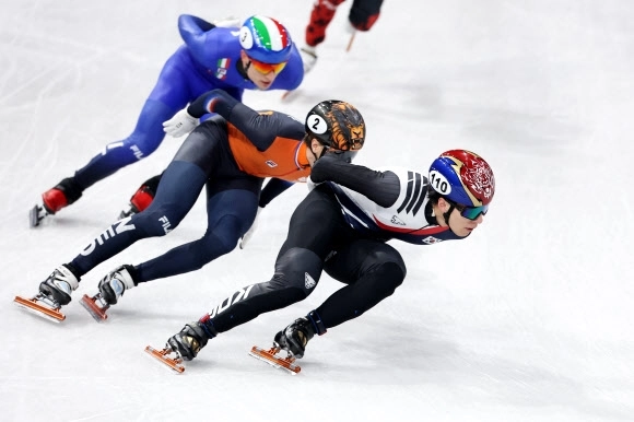 20일(현지시간) 이탈리아 밀라노 아이스스케이팅 아레나에서 열린 2026 밀라노ㆍ코르티나담페초 동계올림픽 쇼트트랙 남자 5,000m 계주 결승. 한국 이정민이 임종언을 밀어주고 있다.