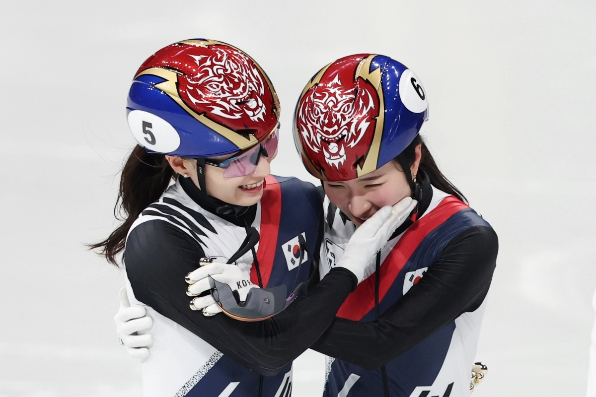 최민정(왼쪽)이 21일(한국시간) 이탈리아 밀라노 아이스스케이팅 아레나에서 열린 2026 밀라노·코르티나담페초 동계올림픽 쇼트트랙 여자 1500m 결선에서 우승하고 우는 김길리를 축하하고 있다. 밀라노 연합뉴스