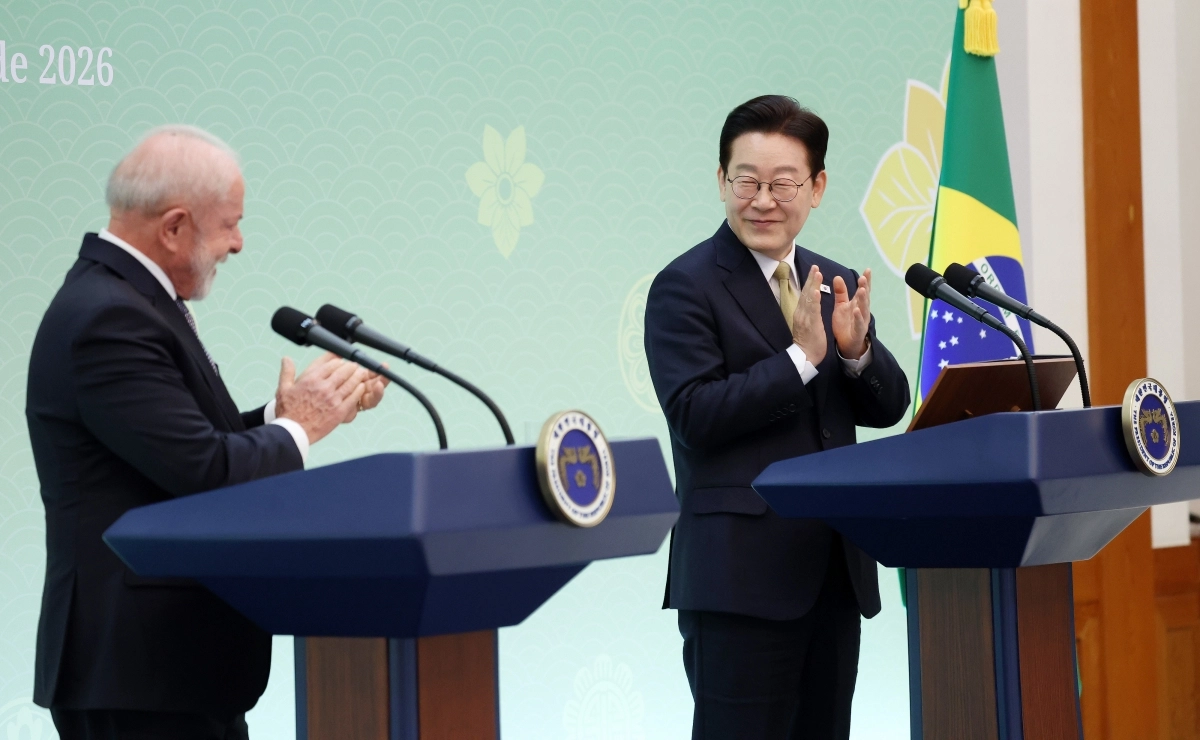 이재명 대통령과 루이스 이나시우 룰라 다시우바 브라질 대통령이 23일 청와대에서 한-브라질 공동언론발표를 마친 뒤 박수치고 있다. 2026.2.23.