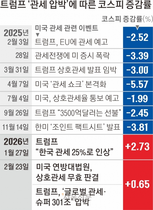 트럼프 대통령이 지난해 4월 2일(현지시간) 한국을 ‘최악의 침해국’으로 지목하며 25%의 상호관세를 부과한다고 한 이후 4월 7일 코스피는 전 거래일 대비 5.57% 폭락했다. 트럼프 대통령이 각국 대통령 앞으로 상호관세율을 적시한 관세 서한을 발송하겠다고 예고했을 때(7월 4일)는 1.99%, “한국의 대미투자액 3500억 달러는 선불”이라고 압박했을 때(9월 26일)는 2.45%씩 급락했다.