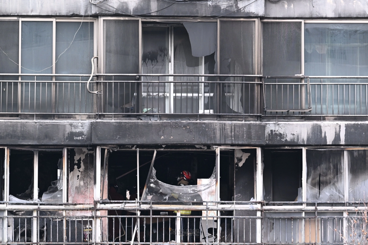 사고 현장은 참혹했다. 불이 시작된 8층을 중심으로 시커먼 그을음이 위층 외벽까지 치솟으며 건물 상부를 통째로 검게 물들였다. 가구들은 뼈대만 남은 채 주저앉았고, 벽지는 고열에 녹아 흘러내리며 콘크리트 벽면을 그대로 드러냈다. 유리창은 산산이 부서졌고, 창틀은 열기로 오그라들었다.