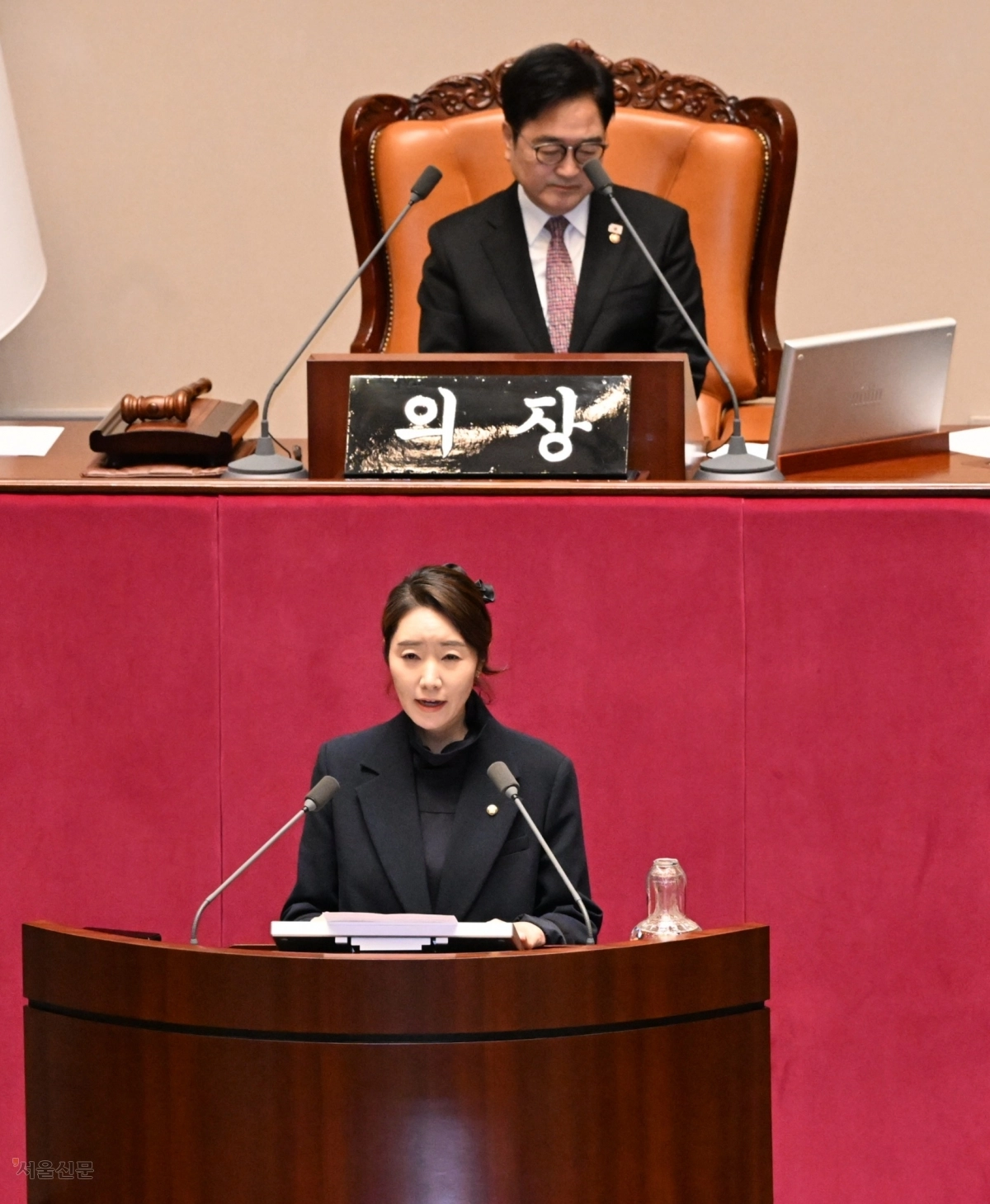 ‘공천헌금 1억 수수’ 혐의로 구속영장이 청구된 무소속 강선우(아래쪽) 의원이 24일 국회 본회의에서 본인의 체포동의안에 대한 신상 발언을 하고 있다. 위쪽은 우원식 국회의장.