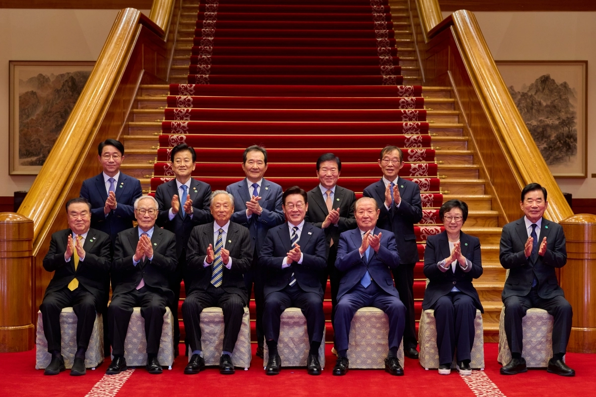 이재명 대통령이 25일 청와대에서 열린 더불어민주당 상임고문단 오찬 간담회에 앞서 참석자들과 기념 촬영을 하고 있다. 앞줄 왼쪽부터 문희상·임채정 전 국회의장, 권노갑 상임고문, 이 대통령, 김원기 전 국회의장, 한명숙 전 국무총리, 김진표 전 국회의장. 뒷줄 왼쪽부터 조정식 대통령 정무특보, 정동영 통일부 장관, 정세균 전 국무총리, 박병석 전 국회의장, 이용득 상임고문.