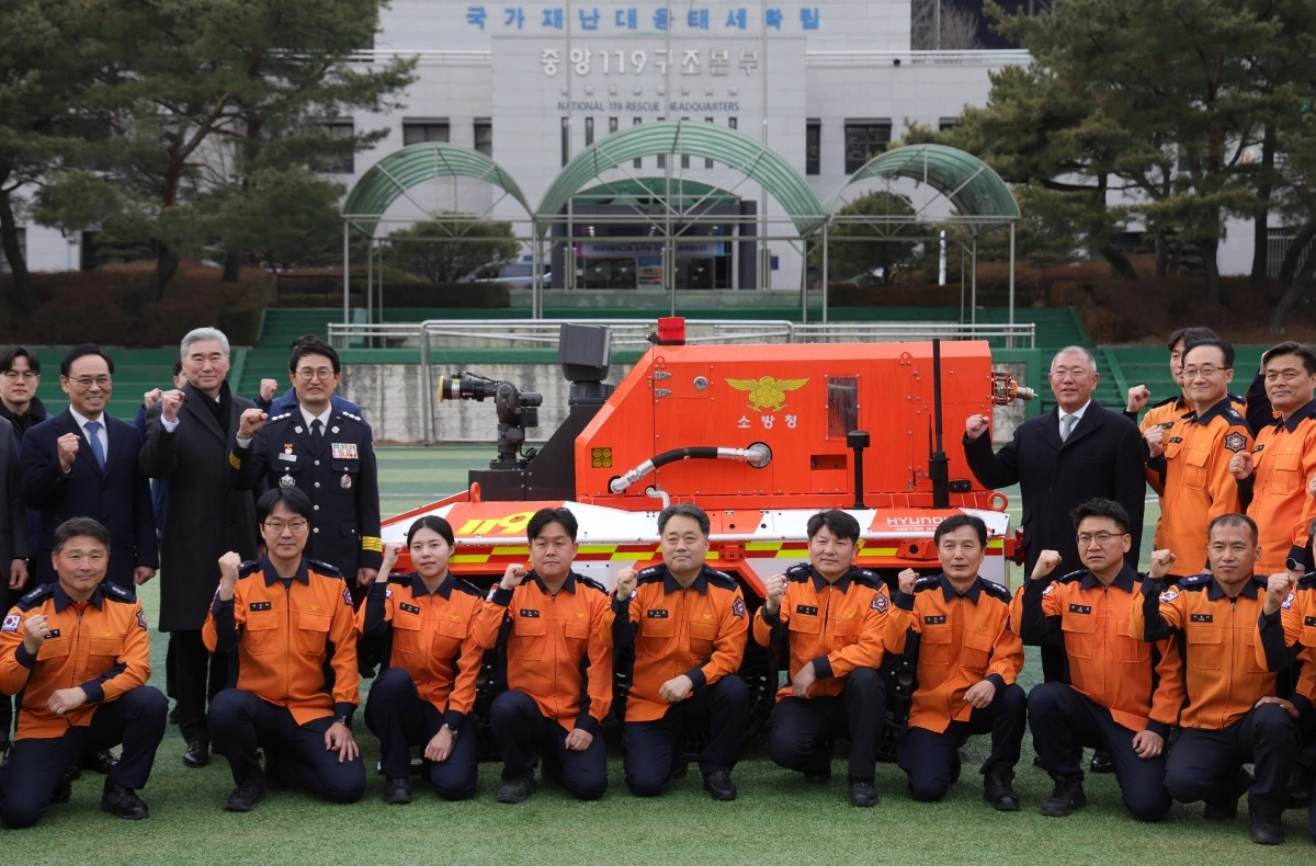 현대차그룹은 지난 24일 경기 남양주에 있는 수도권119특수구조대에서 소방청과 함께 개발한 원격 화재 진압장비 ‘무인소방로봇’ 4대를 공식 기증했다고 25일 밝혔다. 이 자리에는 정 회장과 성 김 사장, 이용배 현대로템 사장, 김승룡 소방청장 직무대행 등이 참석했다.