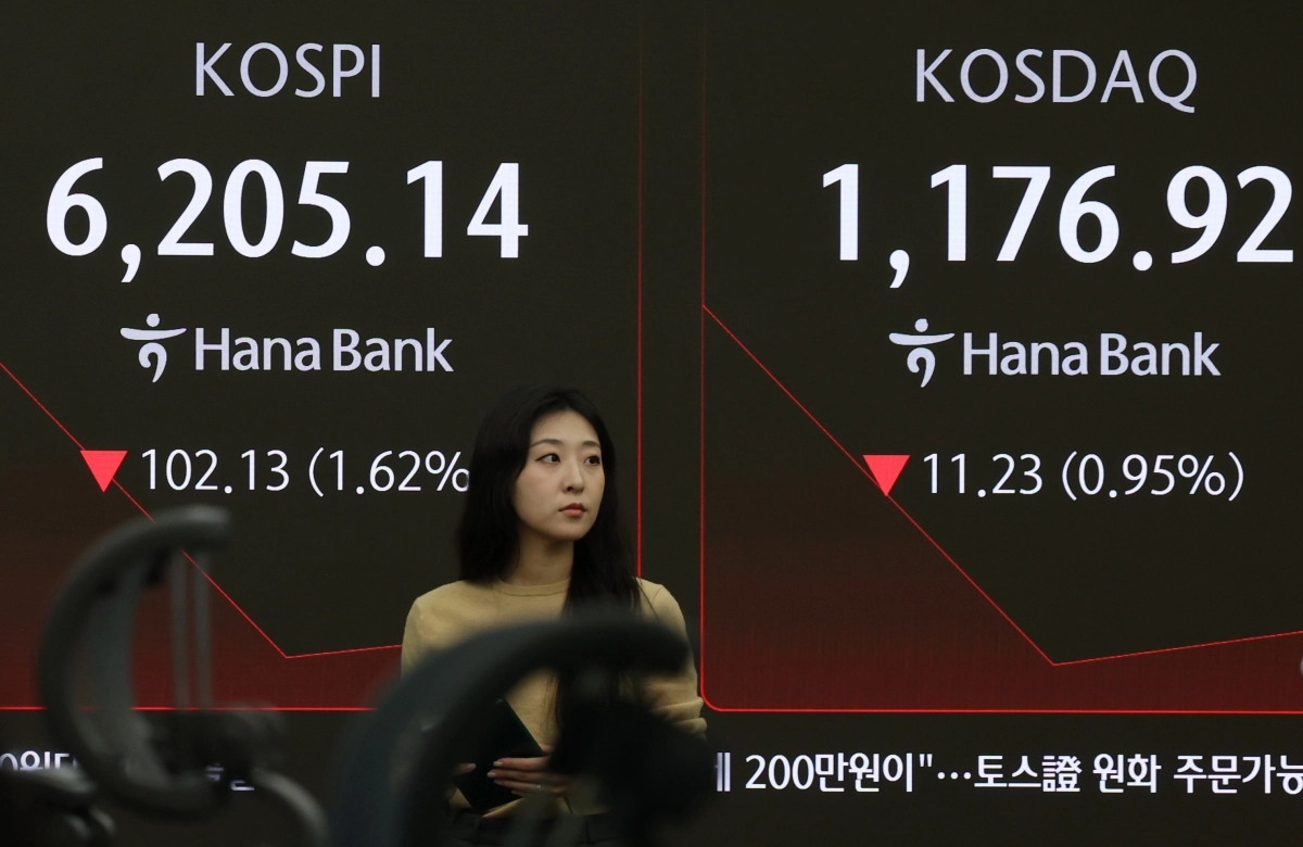 27일 오전 중구 하나은행 본점 딜링룸 전광판에 실시간 코스피가 표시돼 있다. 이날 코스피는 전장보다 109.78포인트(1.74%) 내린 6,197.49로 출발했다. 2026.2.27. 연합뉴스