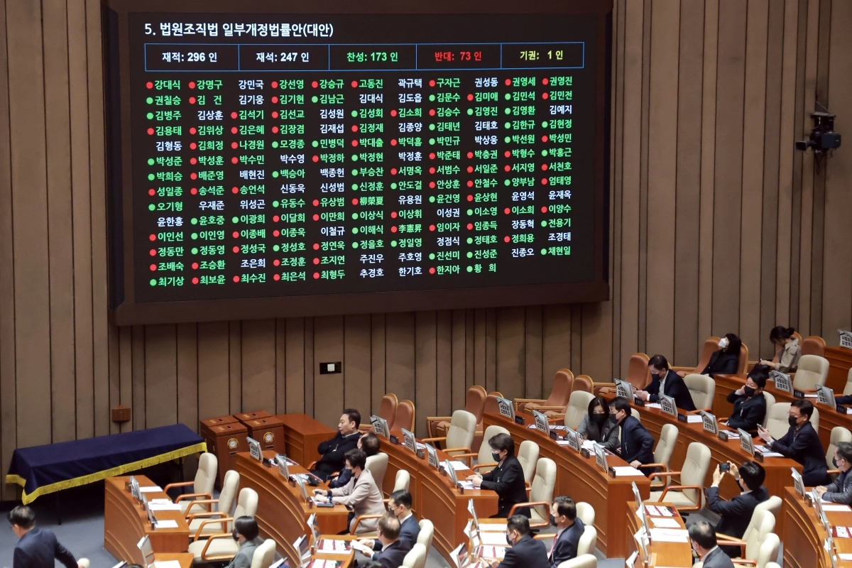 본회의에서 대법관 증원법이 여당 주도로 가결됐다. 현행 14명인 대법관 수를 3년간 해마다 4명씩 순차적으로 늘려 26명으로 증원하는 내용이 핵심이다. 시행은 법 공포 후 2년 뒤다. 이 개정안에는 보이스피싱 등 전기통신금융사기 사건의 신속 처리를 위해 관련 사건을 합의 재판부 아닌 단독판사 관할로 하는 내용도 포함됐다.