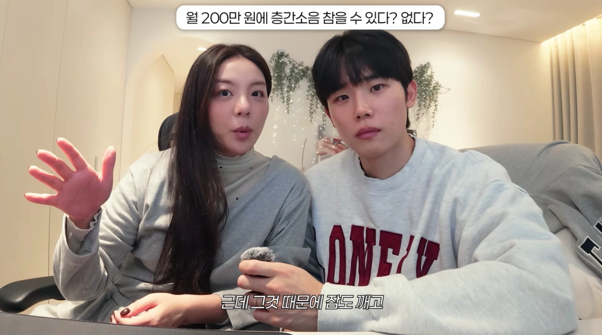 에일리·최시훈 부부가 지난 28일 올린 영상에서 ‘층간 소음 월 200만원 금융치료’ 인터넷 사연에 대해 서로의 생각을 얘기하고 있다. 유튜브 채널 ‘일리네 결혼일기’ 캡처
