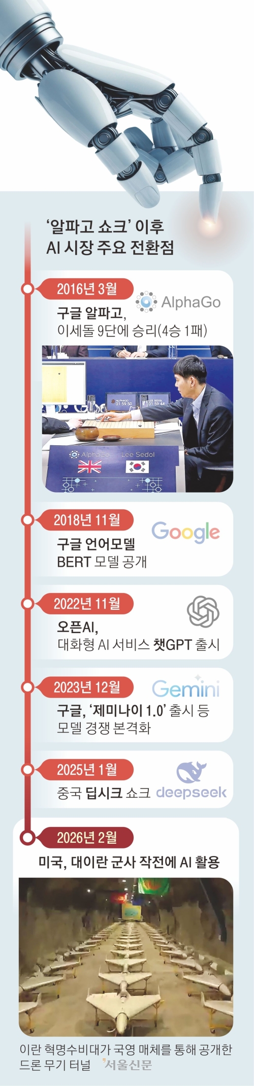 2016년 3월 구글 딥마인드의 인공지능(AI) ‘알파고’가 이세돌 9단을 꺾었을 때 인류는 놀라움과 함께 두려움을 느꼈다. 그로부터 10년이 지난 지금 AI는 로봇 등 각종 기기와 결합하면서 인류가 개발한 가장 편리하고 유능한 도구가 됐지만 동시에 통제 불능에 대한 우려도 커졌다. 특히 이란 사태에서 AI 기반의 정보처리와 저가 무인체계의 결합은 게임체인저로 부상했고 산업·안보·일자리·국가 질서까지 AI가 정보 처리를 넘어 의사 결정마저 주도하는 것 아니냐는 두려움을 안겼다.