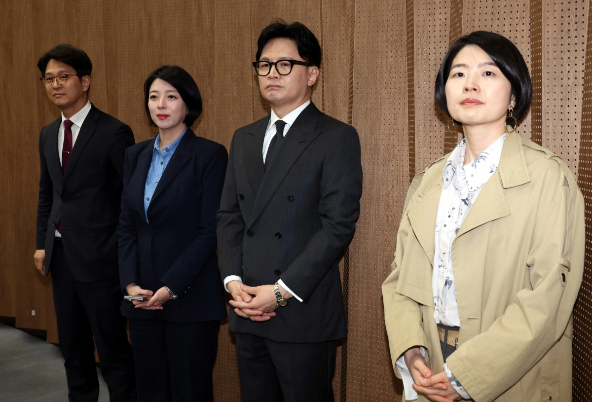한동훈 전 국민의힘 대표와 의원들이 20일 오후 서울 여의도 국회 소통관에서 ‘탈당 권고(사실상 제명)’의 징계 효력이 정지된 김종혁 전 최고위원의 입장 발표 기자회견을 지켜보고 있다. 서울남부지법은 이날 김 전 최고위원이 국민의힘을 상대로 낸 징계 효력정지 가처분 신청을 인용했다. 왼쪽부터 정광재 동연정치연구소장, 배현진 의원, 한 전 대표, 한지아 의원. 뉴시스